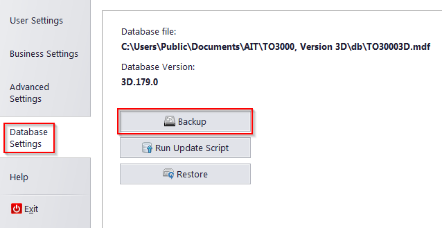 To move your TO3000 data from a PC to a laptop, please create a backup of your Translation Office 3000 database, copy this backup file to your laptop and restore the TO3000 database from the backup file. To create a backup of TO3000 database or restore a database from a backup file, please use the Backup and Restore functions in Database settings. Important notice: we suggest you make a backup of your TO3000 database before performing any other actions with it.