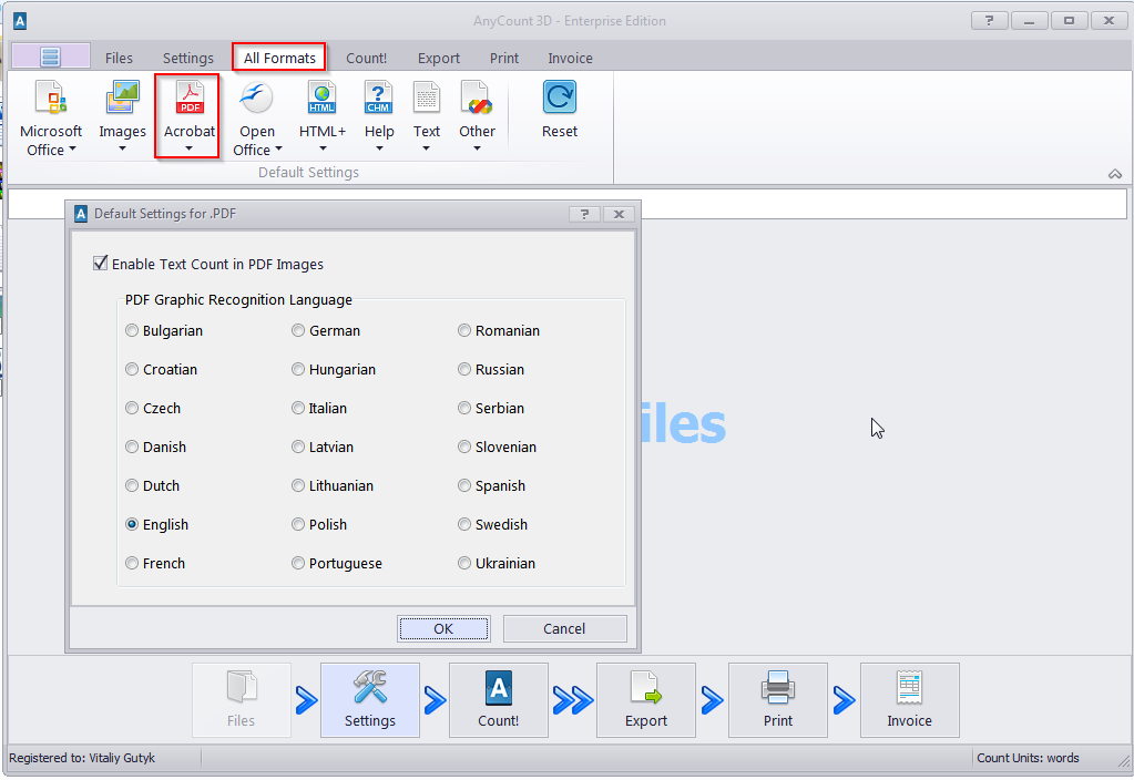 AnyCount does not count text in images inserted in documents of other formats. However, it can count text in standalone image files (PNG, JPG, GIF, or BMP). You will also need to select the correct language in the settings before counting image files. Please keep in mind that only the Enterprise edition of Anycount has OCR functionality | |