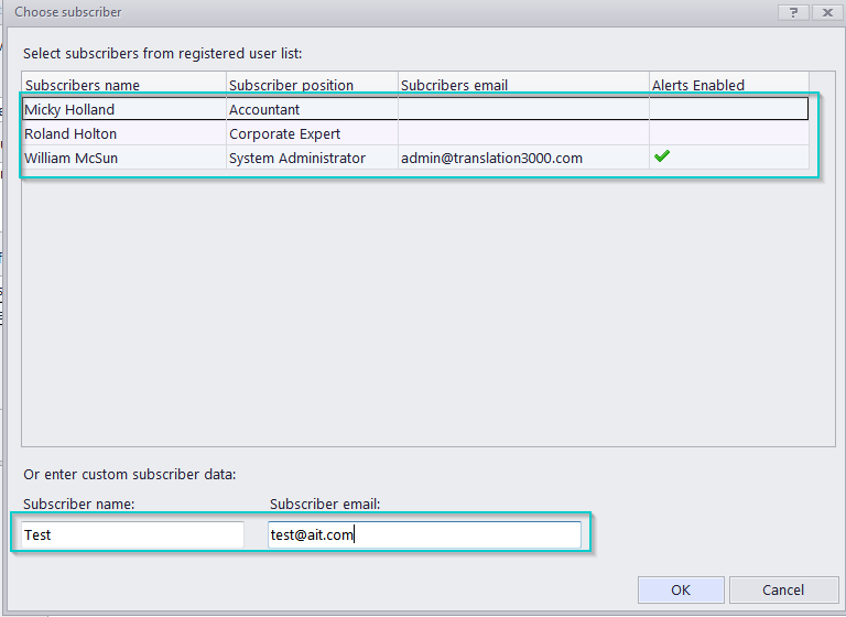 The selected subscriber from the table or the name and address from the "Custom subscriber" fields will be added to the "Notification recipients by subscription" list. Click OK to add the new alert to the list.